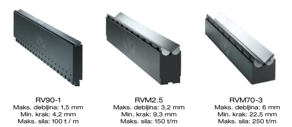 Podesivi modeli ROLLA-V prizmi su namenjeni za limove veće debljine i zatezne čvrstoće, kao i savijanje velikih radijusa. Dostupni su u standardnim širinama od 500 mm i 250 mm. Zbog velikog raspona materijala koji se mogu obrađivati, nije moguće precizno definisati univerzalne tehničke podatke. Na primer: